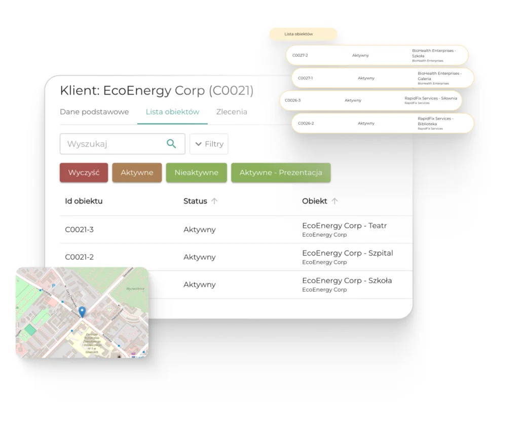 Intuicyjne zarządzanie obiektami – szybka nawigacja po strukturze Twoich klientów i ich obiektach.