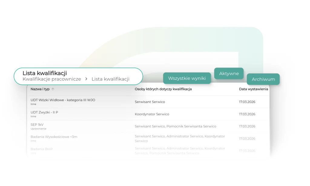 Automatyczne pilnowanie ważności uprawnień – system przypomina o wygasających certyfikatach, eliminując ryzyko pracy bez wymaganych kwalifikacji.